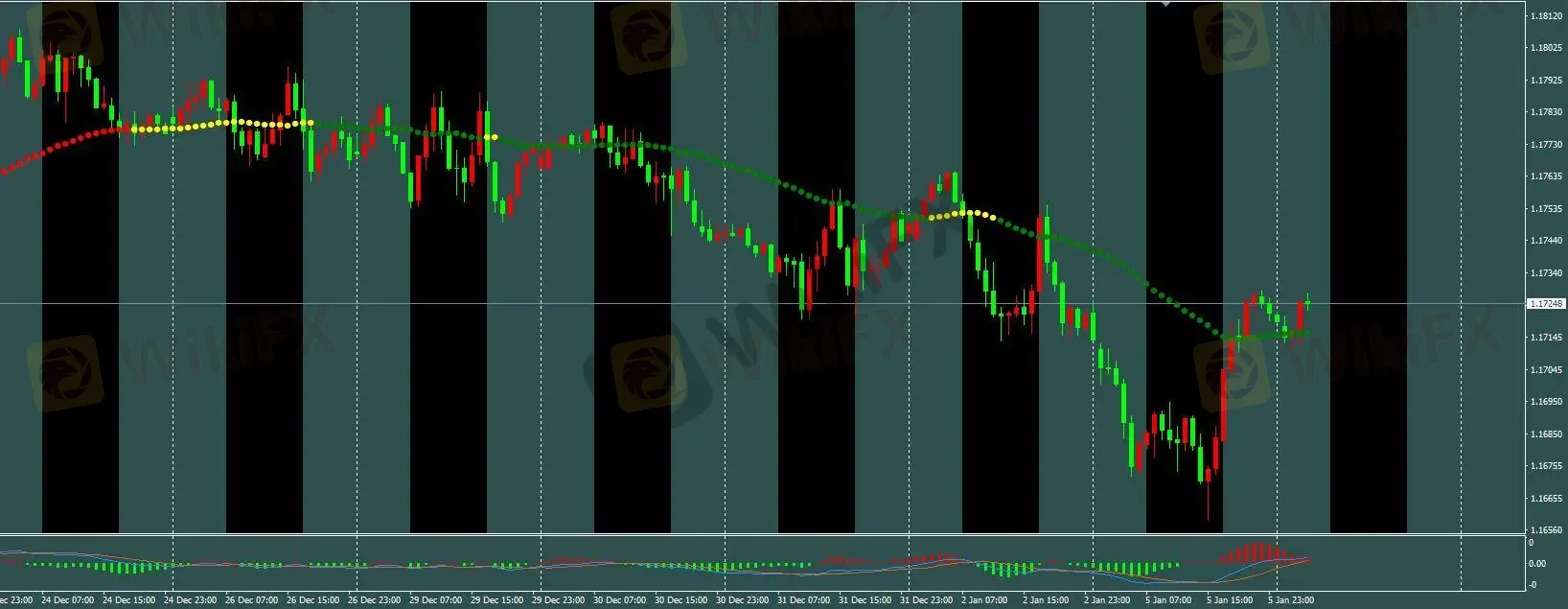 H1 趋势线颜色维持绿色,前期空单已于 1.1777 附近达成盈利目标。日内可参考 M5 综合模型进行短线交易。