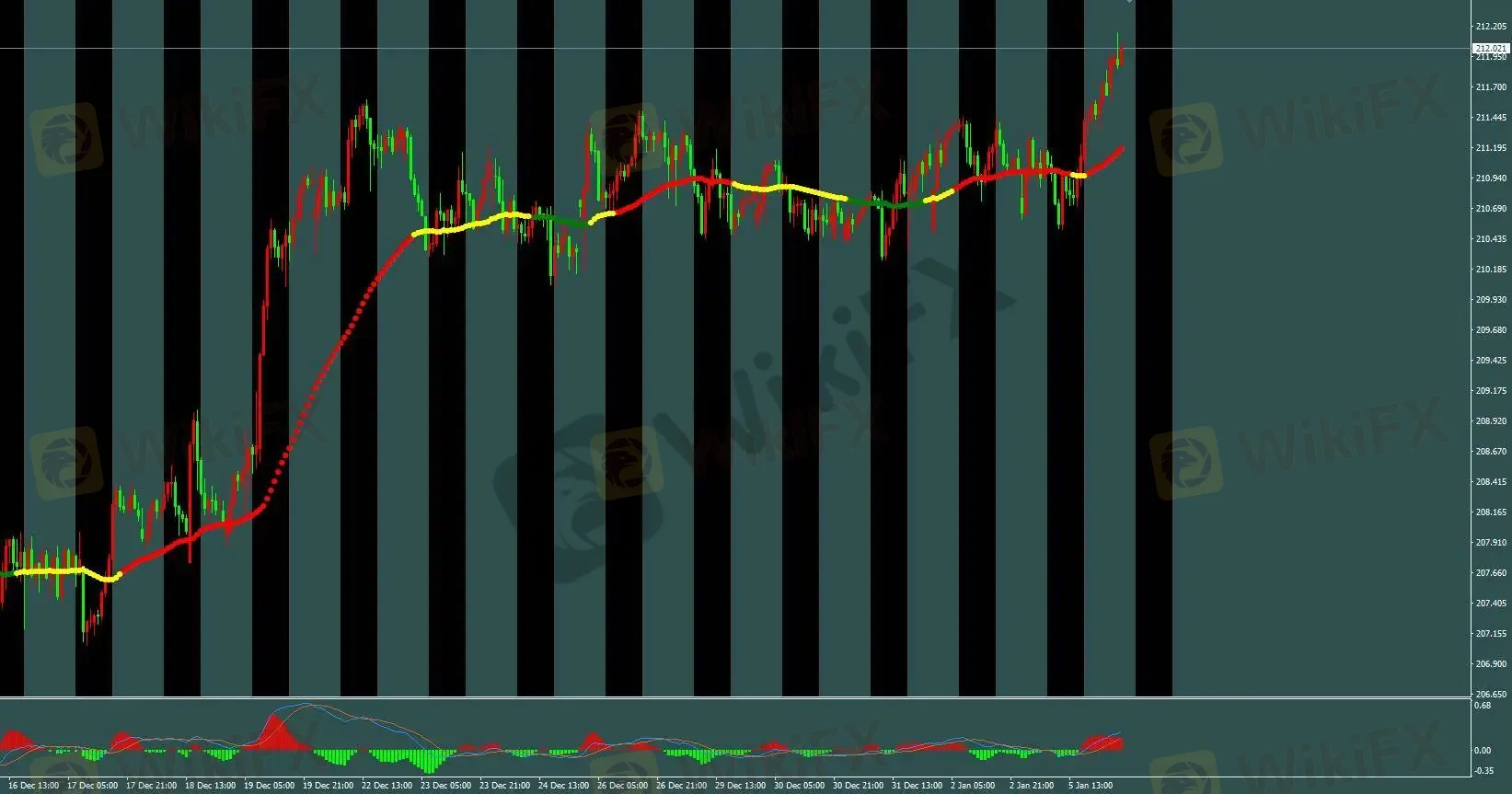 三色线颜色已由黄转红,H1 标准多单已于 210.95 入场并盈利 70 点出场。日内建议依据 M5 基础模型进行操作。