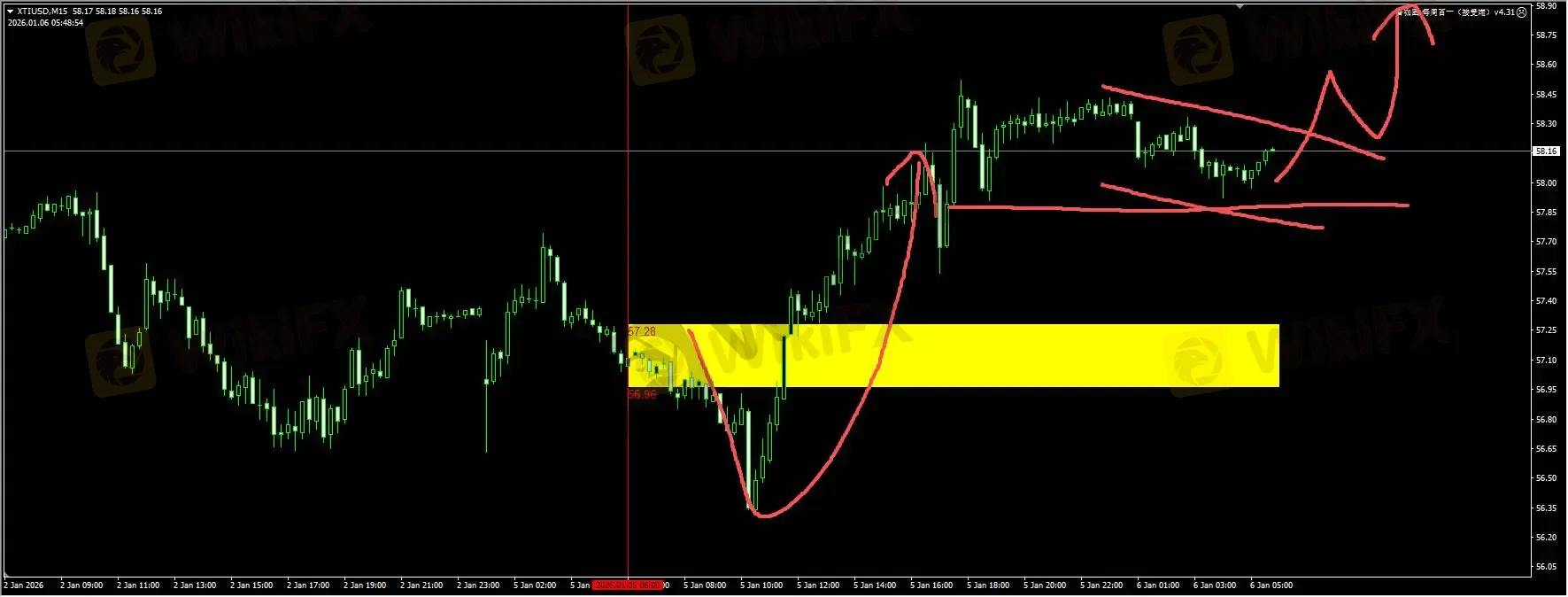 原油:昨天我们插件给到的是57下方清扫流动性,如图黄色区域。扫荡完成之后,出现v型反转,这种走势和我们的建议完美结合。日内关键需求区在58附近,如果守稳,我们建议等待突破回踩买入的信号。详细位置请咨询插件。