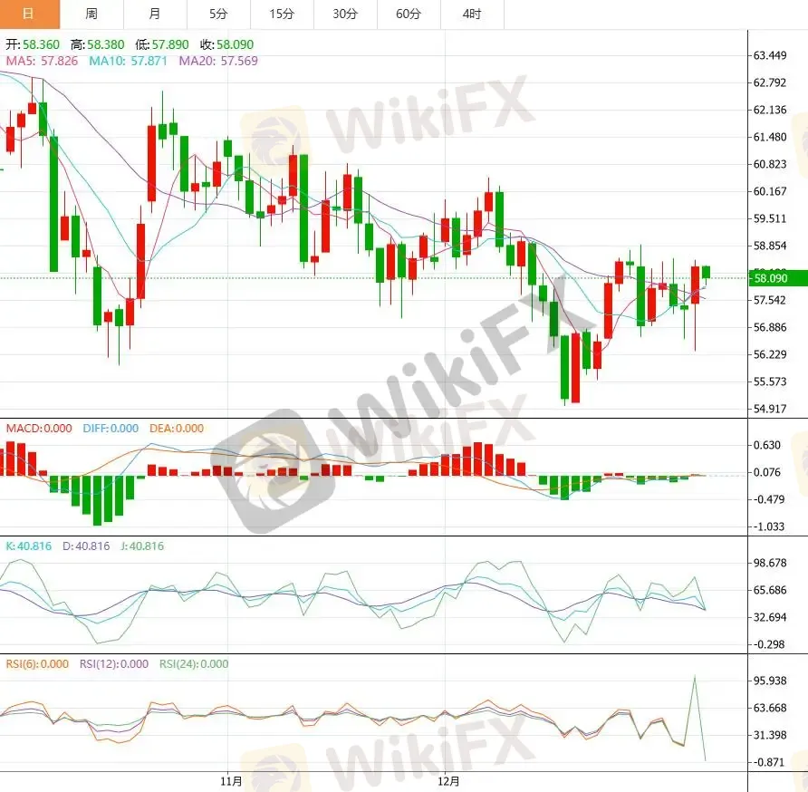 从日线走势来看,WTI 价格在前期快速下行后进入低位横盘整理阶段,当前围绕 58 美元附近反复震荡,显示空头动能有所衰减。技术指标方面,日线 RSI 处于低位区域并逐步走平,暗示超卖压力正在释放,但尚未形成明确反转信号;同时,价格仍运行在主要均线系统下方,中期趋势偏弱格局未被破坏。若 WTI 无法有效站稳 60 美元上方,反弹更可能被视为技术性修正;反之,若跌破前期低点区域,下行风险仍需警惕,整体呈现弱势震荡、等待方向选择的技术特征。