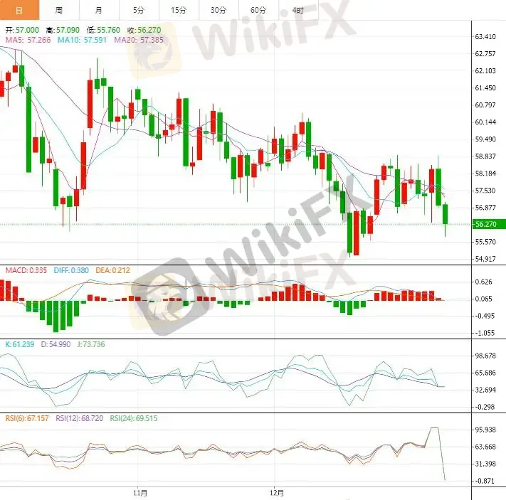 从技术面来看,美原油日线级别仍处于震荡下行通道中运行。价格在此前反弹受阻于 60 美元整数关口后重新回落,显示该区域已转化为明显的阶段性压力位。均线结构方面,短期均线下穿中期均线并持续向下发散,反映出空头趋势尚未扭转。动能指标显示,RSI 仍运行在 50 下方,尚未出现明显超卖信号,表明下行空间尚未完全释放。若后续跌破 57 美元一线支撑,不排除进一步下探前期低点的可能;反之,只有重新站稳 60 美元上方,技术面才有望缓和当前偏弱格局。