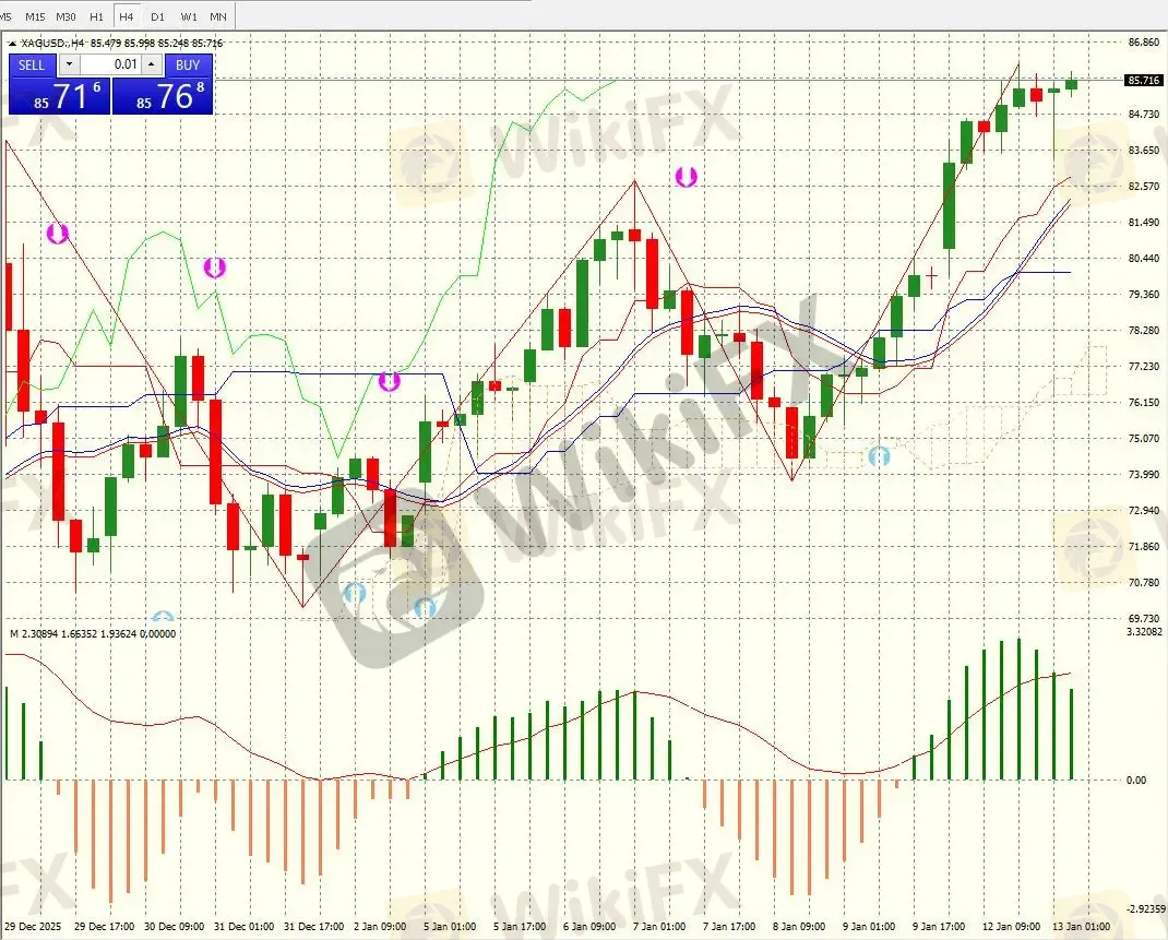 加速上涨阶段(1 月 9 日 - 今日):1 月 9 日价格突破 80 整数关口后进入加速段,连续出现 “实体较长的绿色 K 线”,甚至出现 “跳空高开” 的走势(如 1 月 12 日的开盘缺口),价格从 80 快速冲高至今日的 85.716,仅 4 个交易日涨幅超 7%。此阶段均线系统完全向上发散,5 期均线(图中绿色曲线)与价格的偏离度扩大,反映短期多头动能的集中释放。