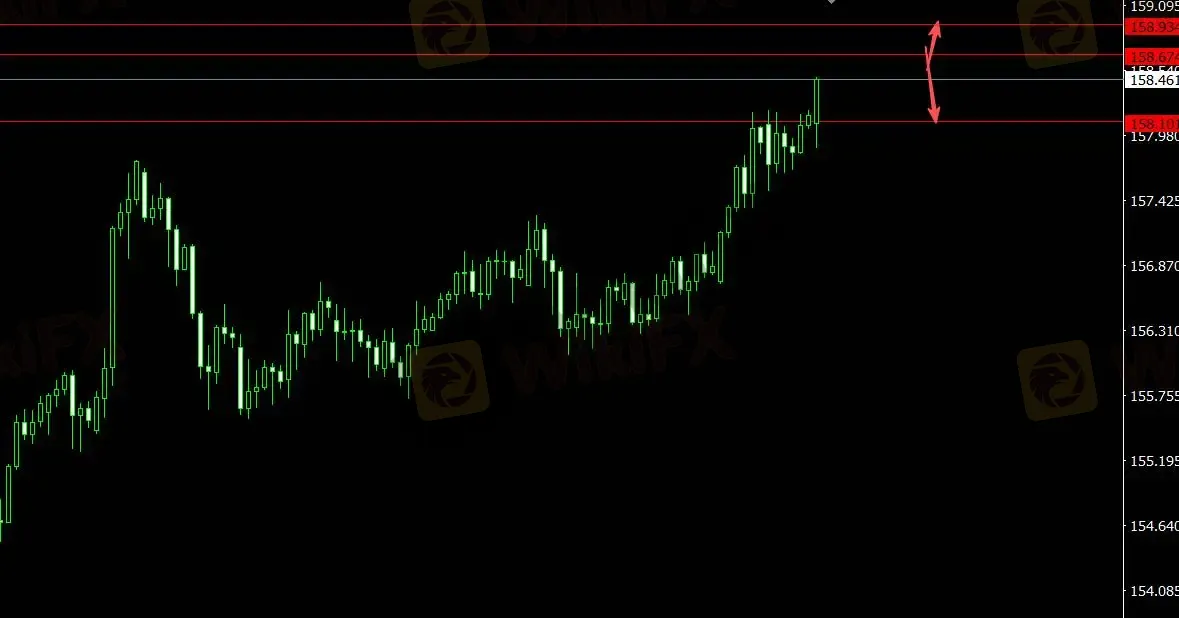 美元指数受支撑,日元上涨,关注支撑位158.110,4小时看多至158.930;关注压力位158.670,4小时看空至157.890。