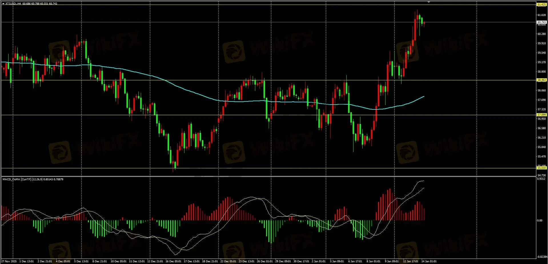 日内策略:昨日震荡拉升,日线收阳。今日早盘小幅调整,延续H4级别金叉但动能不强,59.6一线压力效果明显,完成上破可继续尝试短多。下方支撑关注M30级别144均线结合58.9,有效下破可尝试短空,带动H4级别死叉。