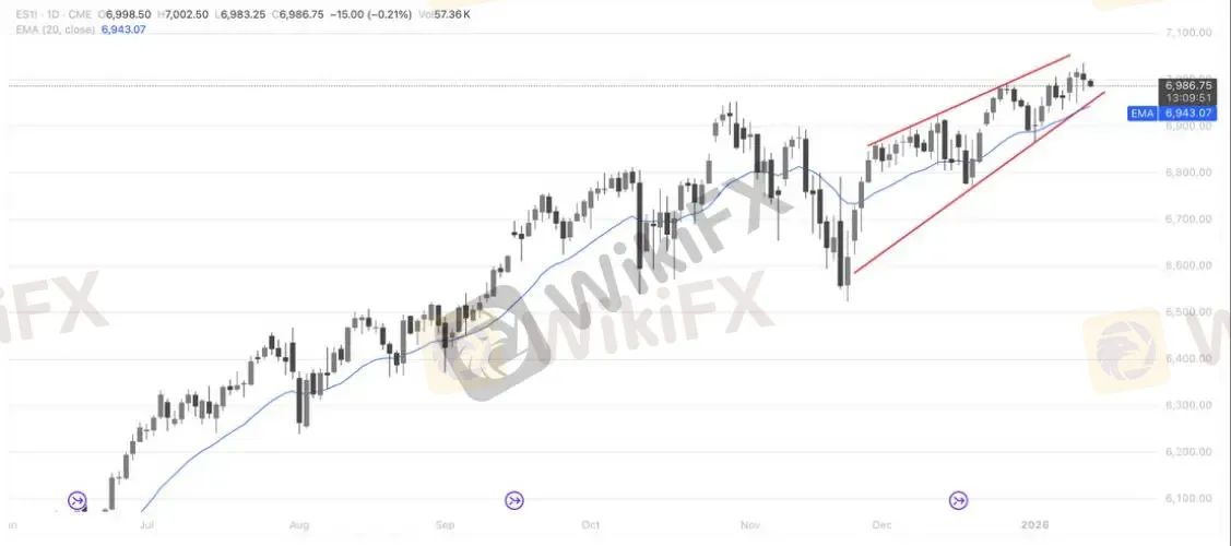 从日线结构看,指数整体仍运行在明确的上升通道内,中长期趋势保持完好。价格始终围绕20日EMA震荡上行,回踩均能获得支撑,显示趋势资金并未撤离,反映短期追涨意愿下降,市场进入以时间换空间的消化阶段。只要价格维持在EMA及通道下轨之上,这更偏向趋势中的整理而非转空;若后续有效跌破通道并失守均线,才需警惕阶段性回调风险。整体判断:趋势仍多,但短线不宜追高,关注回踩结构是否健康。