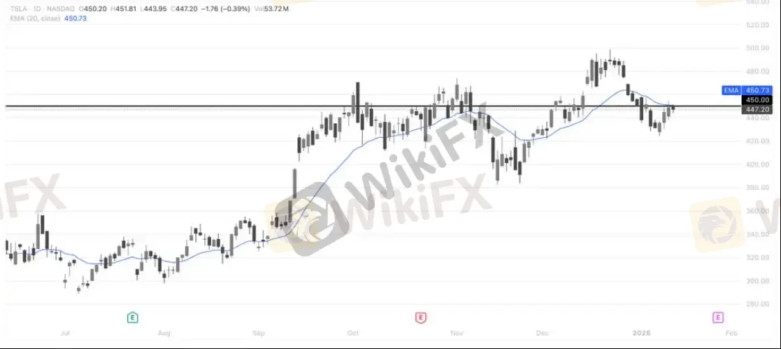 特斯拉在前期冲高回落后进入关键技术博弈区,450 美元已成为当前短线走势的核心阻力位。从结构上看,若股价今日收盘能够有效站稳 450 美元上方,将确认回踩后的企稳,短线反弹有望顺势延续并重新测试上方压力区;反之,若价格跌破昨日低点,则意味着反弹动能失败,调整结构仍未结束,回调走势或将延续。整体而言,当前处于方向选择窗口,收盘价表现对短线判断至关重要。