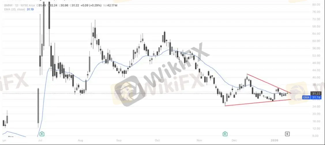在加密资产阶段性反弹的背景下,币股 BMNR 的技术结构开始具备关注价值。日线来看,股价在前期深度回调后,于 30 美元附近构筑明显的收敛整理形态,下方低点逐步抬高,而上方受制于下降趋势线压制,显示多空力量正在重新平衡。若后续能放量突破下降趋势线并站稳均线之上,股价有望跟随加密市场情绪走出修复性反弹;反之,若跌破收敛下沿,则仍需防范弱势延续。整体而言,BMNR 正处于“方向选择前夜”,加密市场的持续性将成为关键催化。