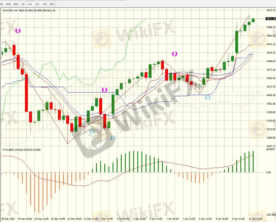 摘要:一、走势脉络:多头趋势的延续性已确立12月底黄金经历一波回调,低点触及4290附近后逐步筑底,进入1月后多头开始发力:先是依托均线缓慢攀升,在1月7日突破前期震荡区间上沿(约4450)后,行情进入加速拉升阶段——截至今日,价格已从阶段低点上涨超300点,且回调K线的实体普遍较短、回调幅度有限,多头趋势的延续性与主导性均较为明确。二、技术面核心信号:多头仍处强势状态1. 趋势与K线结构:4小时周期内