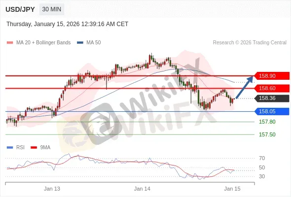 美元/日元 当日内: 超短线(当日内)支撑位在158.05附近。