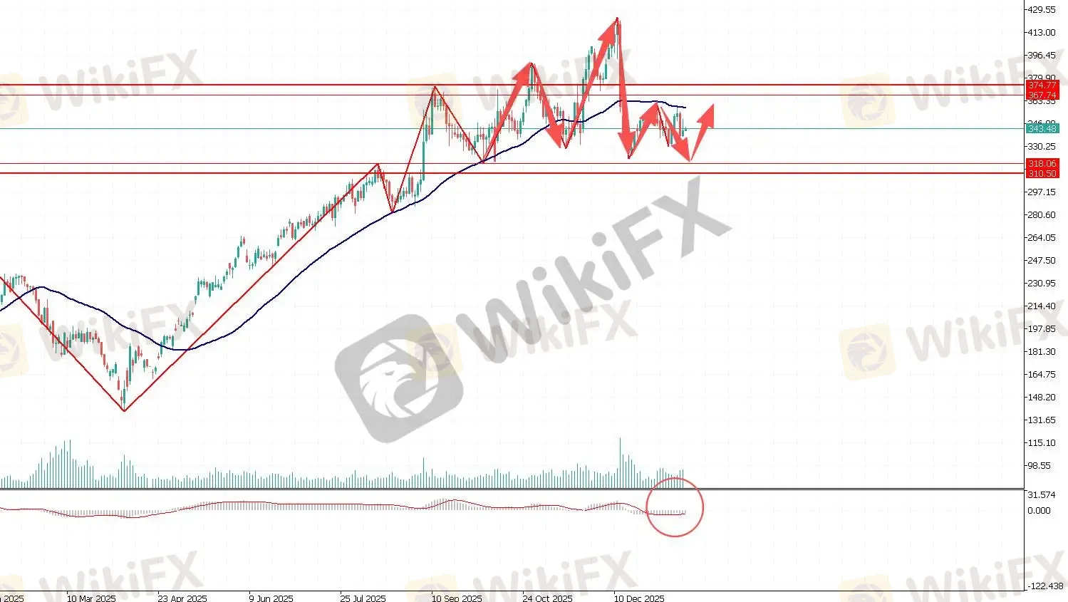 第一阻力位:360.00 第一支撑位:325.00