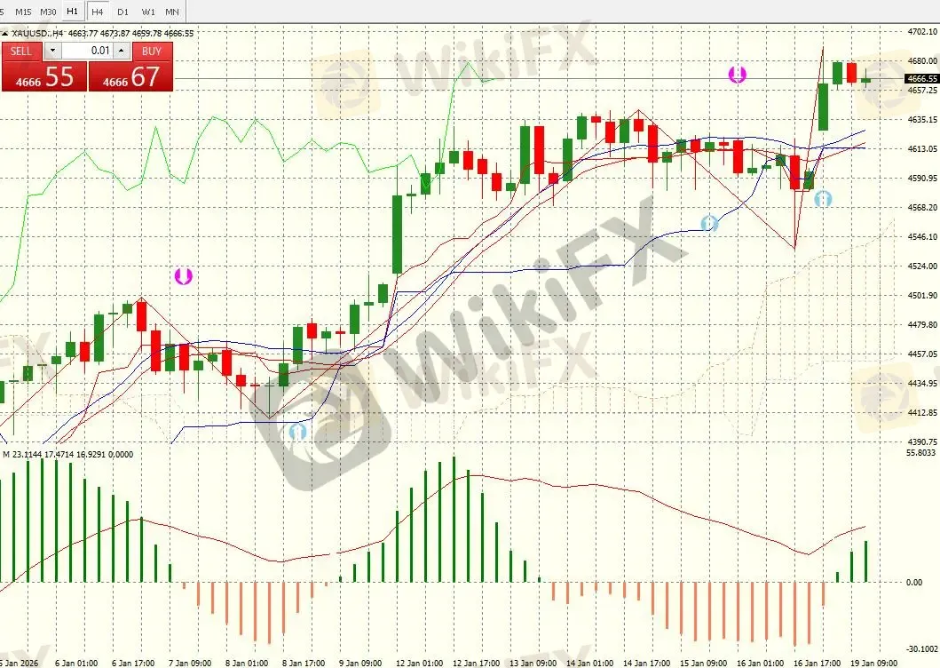 摘要:今日黄金 XAUUSD 在 H4 周期走势上延续了近期的反弹节奏,当前价格企稳于 4666 美元一线,多头力量仍在主导盘面,但短期承压信号已开始显现。从均线系统来看,价格持续站稳于短期均线上方,中长期均线呈现多头排列,显示趋势性上涨格局未被破坏。不过,当前价格已触及前期震荡平台上沿,4680-4690 美元区间形成关键阻力带,若无法有效突破,大概率会引发技术性回调。指标层面,图中震荡类指标已进入超