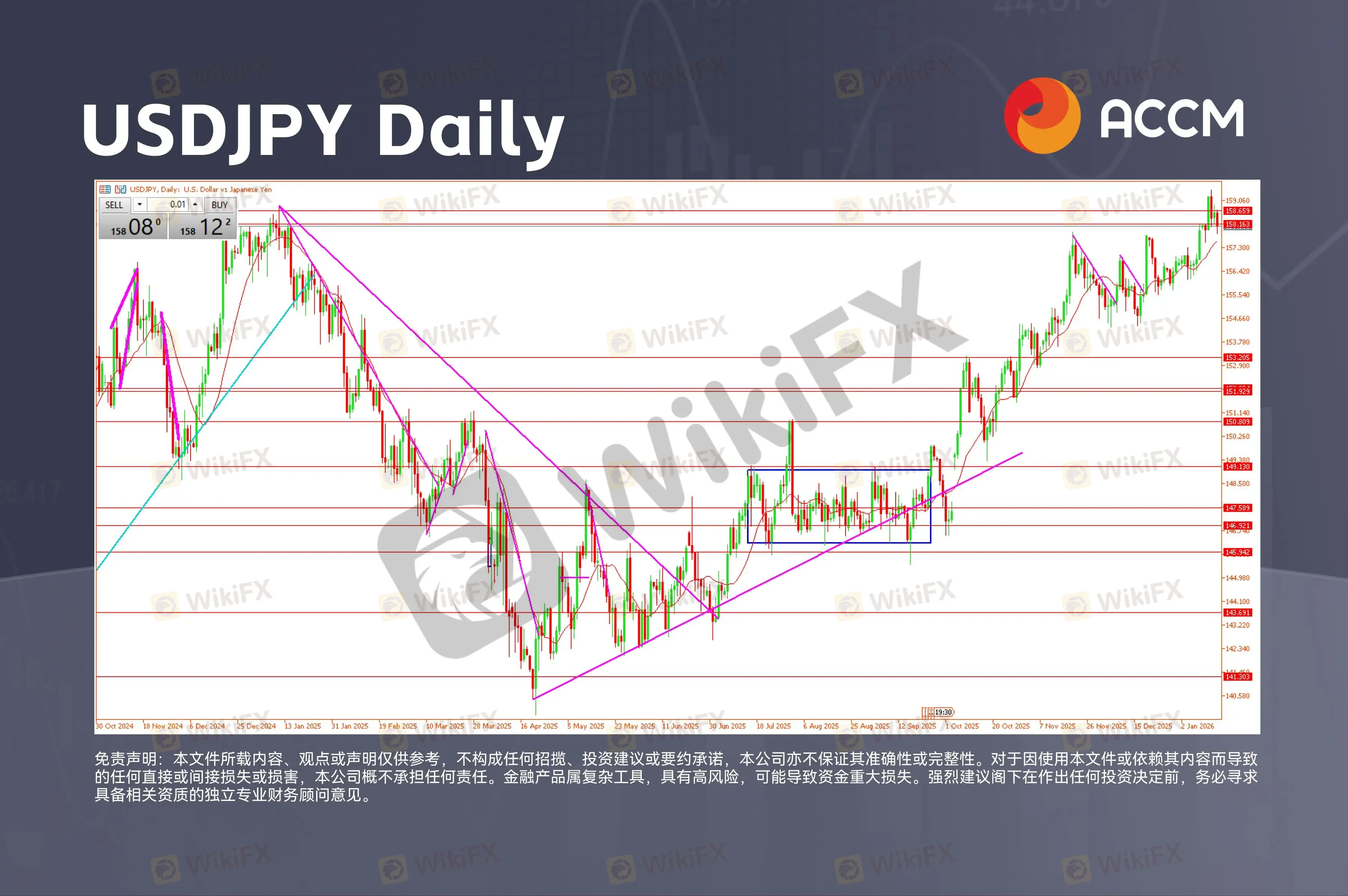USDJPY 已进入机构交易台所称的 “干预危险区(Intervention Danger Zone)” 。本周,汇价不断测试日本财务省(MoF)的容忍底线,价格行为表现为:在 159.00 上方反复 “扫止损” 获取流动性后,迅速回落。这种走势表明,市场在基本面上依然偏多,但在技术层面极度忌惮一场突如其来的、可能动辄数百点的干预冲击 。