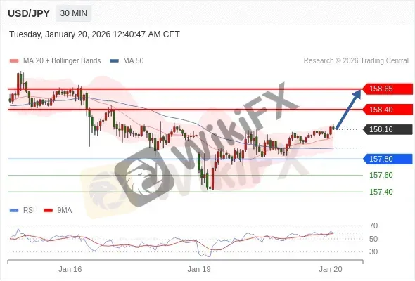 在 157.80 之上,看涨,目标价位为 158.40 ,然后为 158.65。