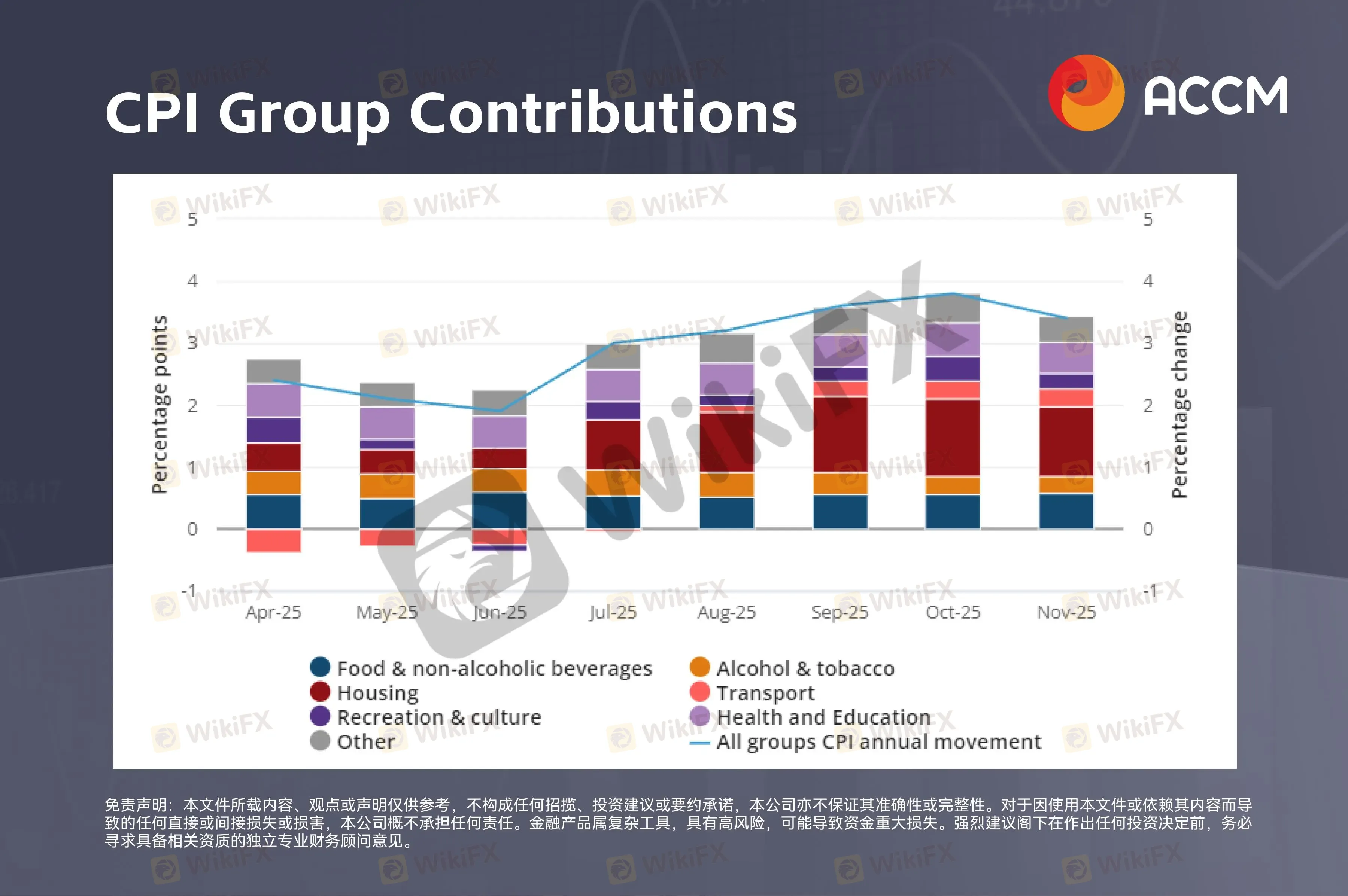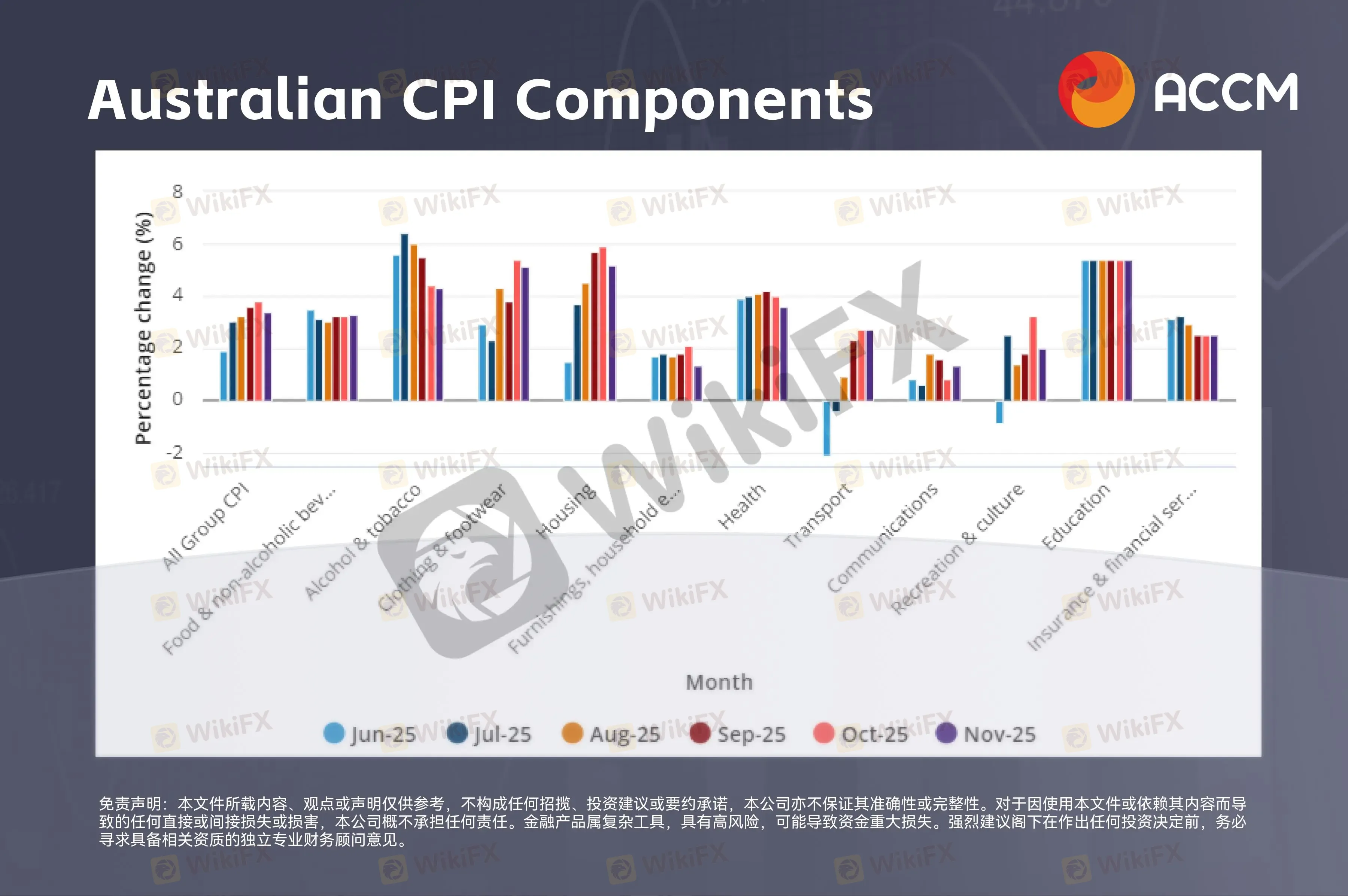 摘要:澳洲金融市场在本周初进入相对谨慎的运行阶段,投资者关注焦点高度集中在通胀路径、货币政策预期以及由此引发的跨资产定价调整。随着最新一轮消费者物价指数(CPI)数据公布在即(1月28日),市场整体风险偏好有所收敛,股市、汇市与利率相关资产的短期波动性均出现抬升。澳洲消费者物价指数各类别价格变化,数据来源:澳洲统计局从宏观层面来看,市场普遍预期澳洲通胀将继续温和回落。此前公布的月度CPI数据显示,10月