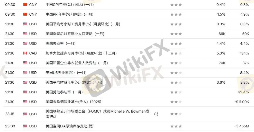 周三(2月11日)本周,美国1月非农就业数据与消费者物价指数将同步公布,这两份核心报告将直接决定美联储2026年降息节奏,甚至是否降息,成为市场判断美国经济与货币政策的关键依据。去年秋季,波动疲软的就业市场是美联储的核心顾虑,为对冲失业率上行、招聘大幅降温的风险,美联储在2025年末三次下调基准利率,全力稳住就业市场。如今,市场关注重心已重新转向居高不下的通胀问题。机构预测1月美国新增就业5.5万人,失业率维持4.4%,当前失业率是核心观测指标,经济仅需新增约5万个就业岗位,就能稳住低失业率,只要就业保持韧性,美国经济就能规避衰退风险。主流观点认为,2026年关税影响将逐步消退,住房成本、劳动力成本增速放缓,会推动通胀持续向2%的目标靠拢。但通胀仍存隐忧,美联储有官员直言通胀顽固停留在目标上方,加之1月企业集中调价,以及关税成本向消费者转嫁,通胀存在超预期上行的可能。美元指数回落至96.70;非美货币反弹,澳元兑美元涨至0.7120,欧元兑美元上行至1.1910附近,离岸人民币到达6.91。现货黄金反弹至5046美元附近,现货白银来到82.30美元附近。原油反弹至64.50美元附近。
