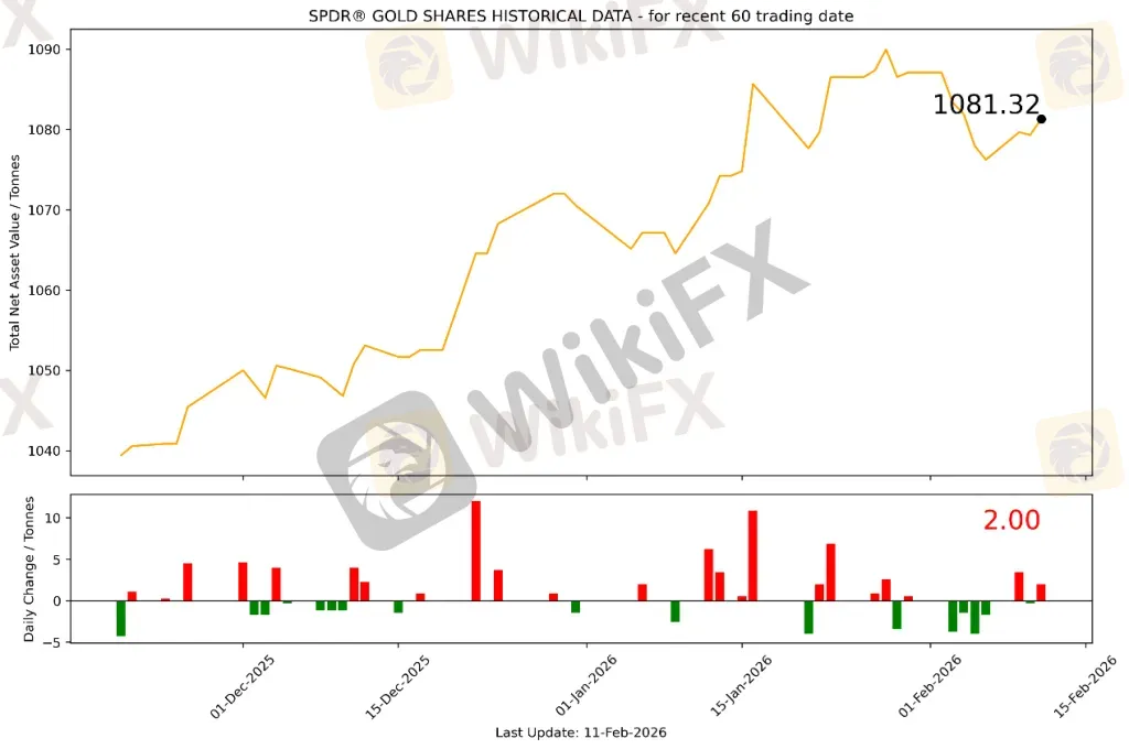 截至2026年2月11日,全球最大的黄金ETF SPDR Gold Trust持仓量为1081.32吨,较上一个交易日增加2.00吨。2026年2月11日现货黄金自5026.17美元/盎司开盘后先震荡上行,最高向上触及5119.159美元/盎司,后技术性回调,受非农数据影响盘中大跌60美元,后迅速反弹至5100美元附近。最终收于5084.75美元/盎司,涨60.87美元或1.21%。