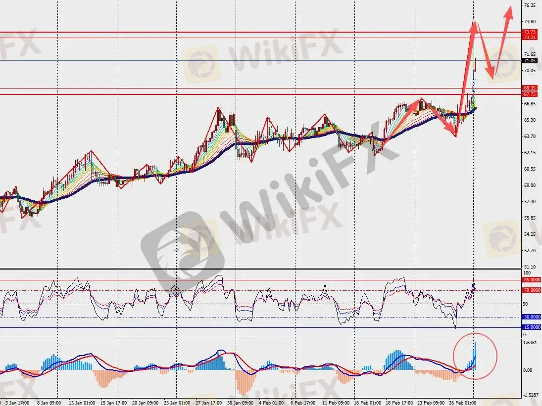 技术面:原油H4级别上涨回落,但依旧在48日多空分界线上方运行。此外,MACD双线和量能柱在零轴附近扩张。如果冲突持续,全球将面临中东石油流动的重大中断,除非美国能削弱伊朗的海军和军事力量,确保霍尔木兹海峡畅通。