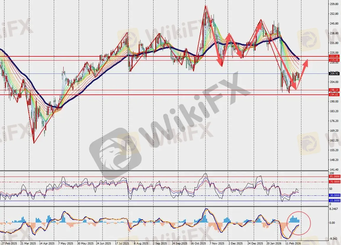 第一阻力位:220.00 第一支撑位:197.00
