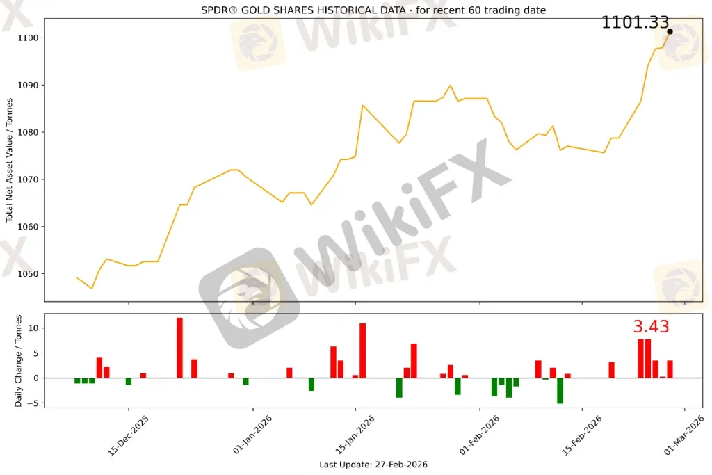截至2026年2月27日,全球最大的黄金ETF SPDR Gold Trust持仓量为1101.33吨,较上一个交易日增加3.43吨。2026年2月27日现货黄金开盘于5181.1美元/盎司,亚盘和欧盘交易时间在5168-5200美元区间震荡,最低向下触及5167.142美元/盎司,美盘交易时间突破并站稳5200美元一线,随后震荡上行,最高向上触及5279.098美元/盎司,最终收于5278.607美元/盎司,涨97.507美元或1.88%。