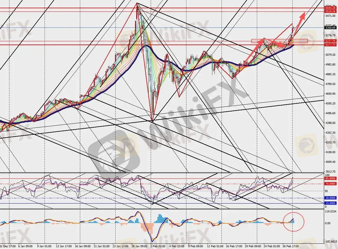 黄金H4级别大幅上涨,MACD双线和量能柱进一步扩张。本轮金价上涨的持续性仍将主要取决于地缘风险的演变。短期来看,金价可能呈现高位震荡加剧的态势,冲高后回调的风险亦显著上升。