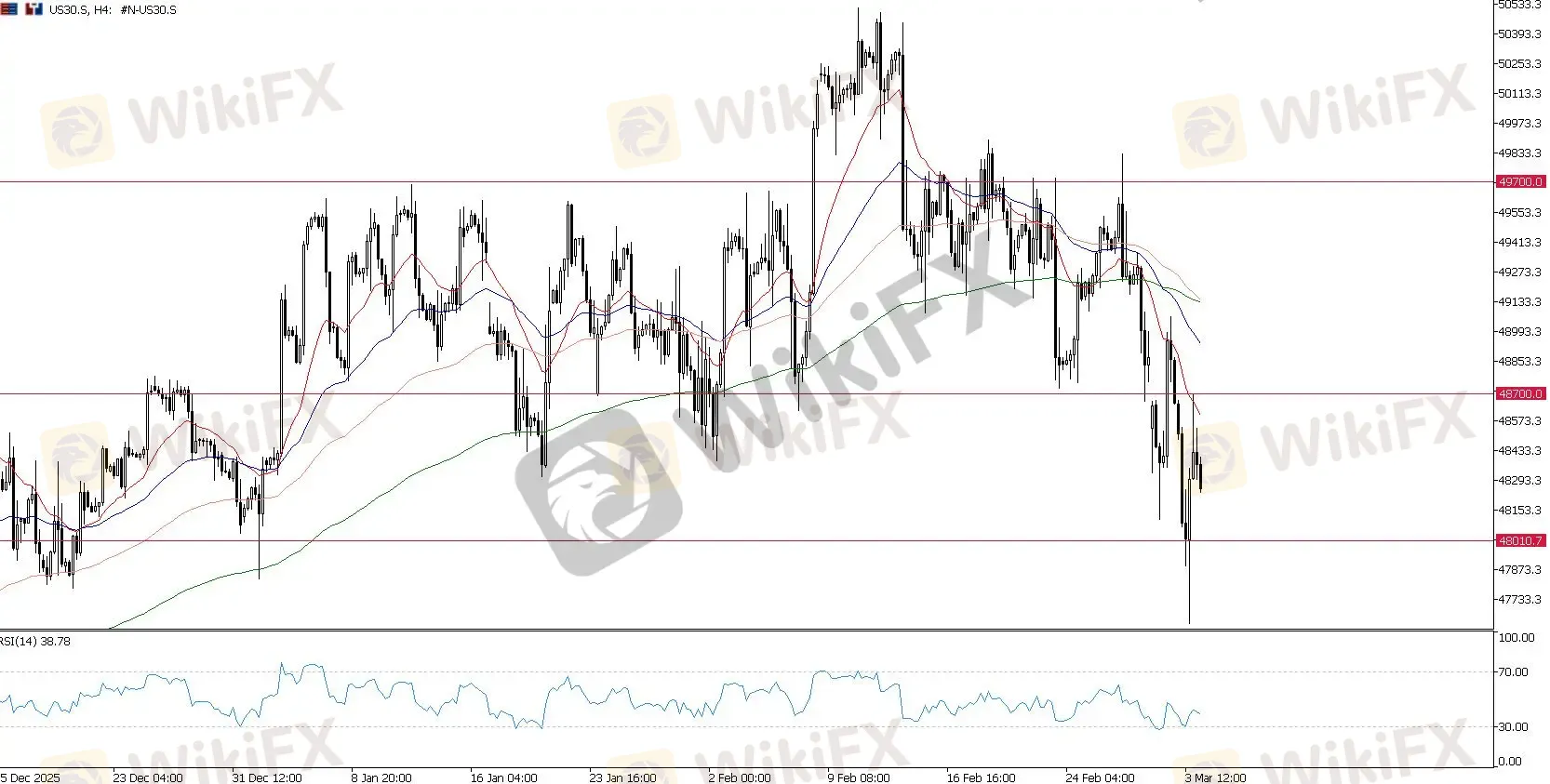 如果我们看到果断跌破 48,000 点,更广泛宏观趋势内的更深度回调可能会将道琼斯指数推低至 47,000 至 46,800 区域,使该指数更接近其 200 日移动平均线。