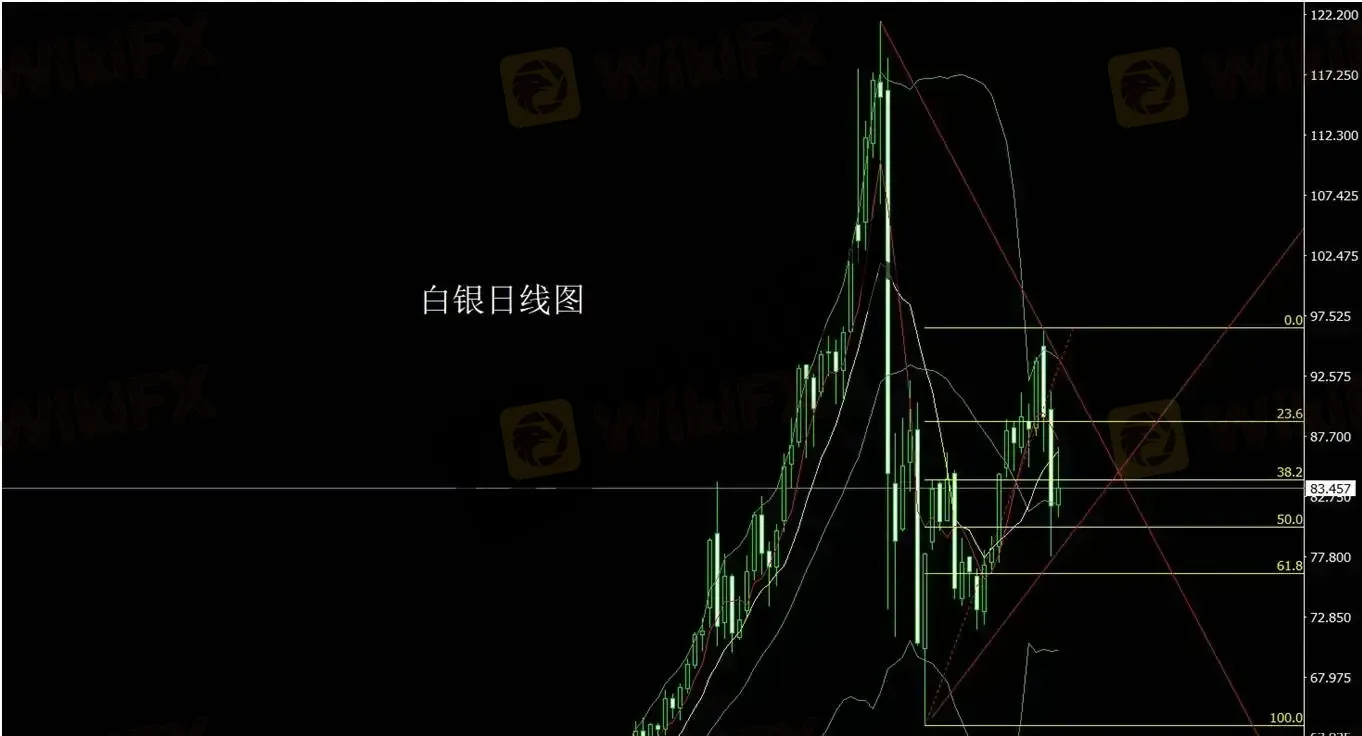 白银市场昨日走势与黄金类似。价格开盘于82.061附近后短线回落至81.007,随后多头快速发力,盘中最高触及86.81,但高位同样出现明显回落,日线最终收于83.457附近。