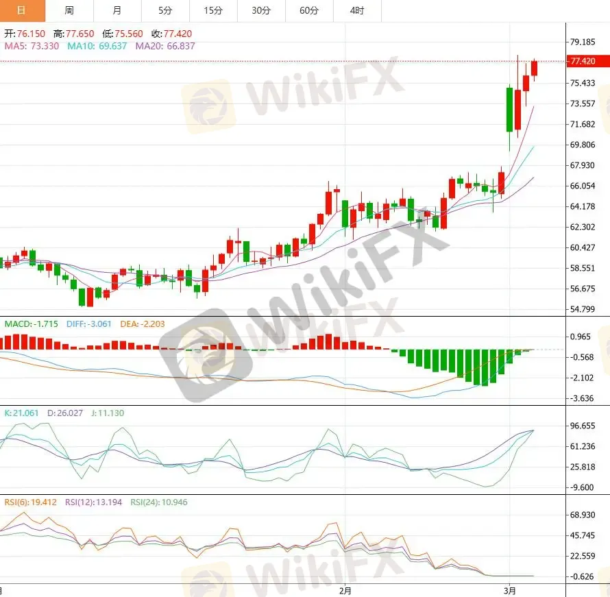 国际油市本周延续强势表现,WTI 原油在亚洲时段交投于 76.60 美元/桶附近,录得连续第三个交易日上涨。与以往由需求预期改善驱动的行情不同,本轮上涨的核心逻辑指向供应中断风险的快速放大。美、以、伊三方冲突骤然升级,伊朗方面对能源设施展开报复性打击,引发市场对原油供应稳定性的普遍担忧。