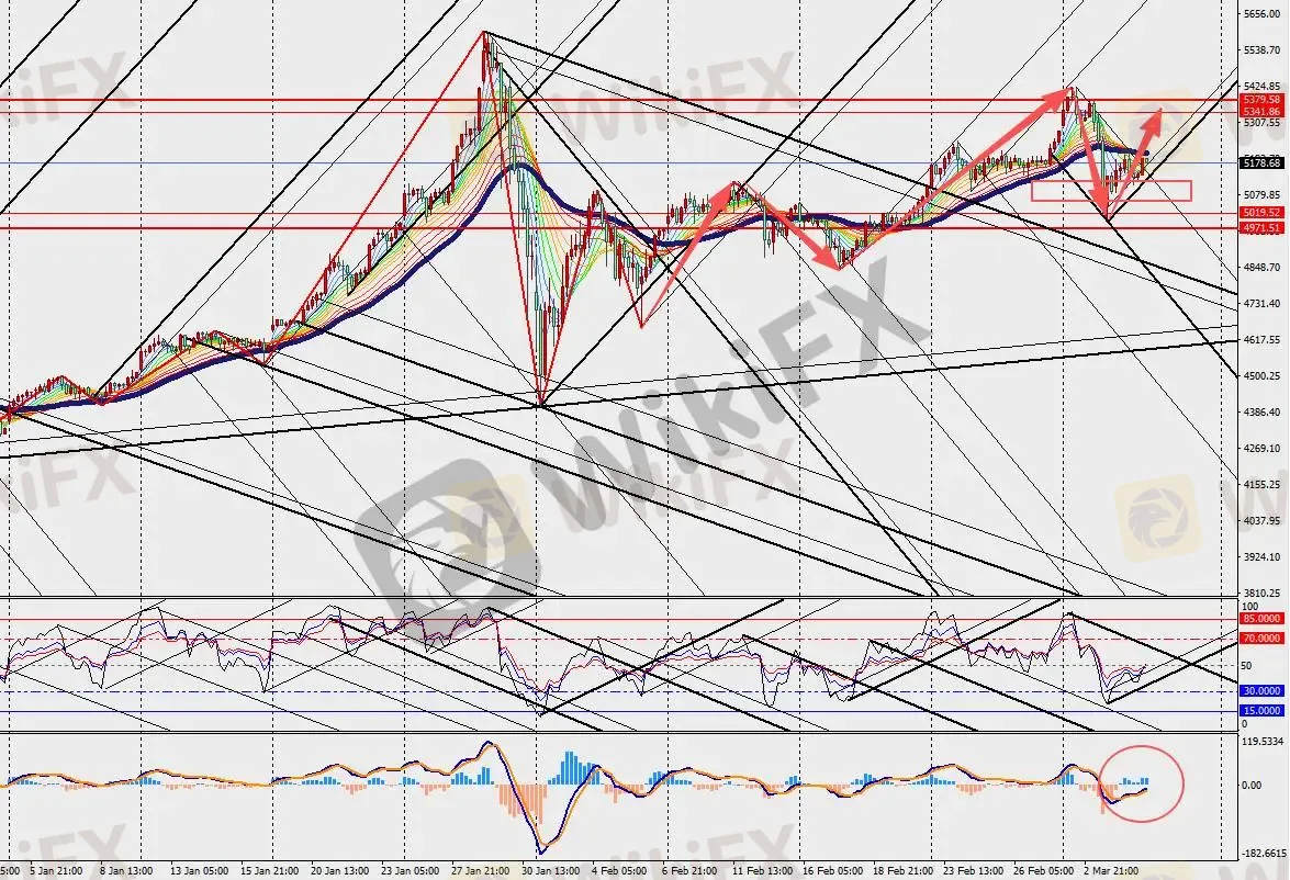 黄金H4级别震荡反弹,MACD双线和量能柱在零轴下方扩张。投资者需密切注视非农就业数据是否会进一步推升美债收益率。如果实际利率维持韧性,黄金的下行压力将延续至5100关口。在大型机构的套现动作停止之前,任何盲目的抄底行为都可能面临流动性陷阱的再次收割。