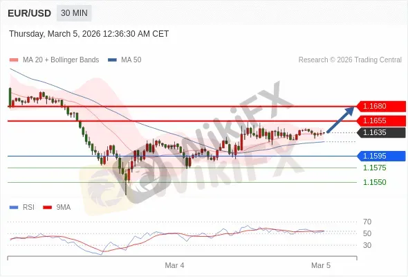 交易策略: 在 1.1595 之上,看涨,目标价位为 1.1655 ,然后为 1.1680。