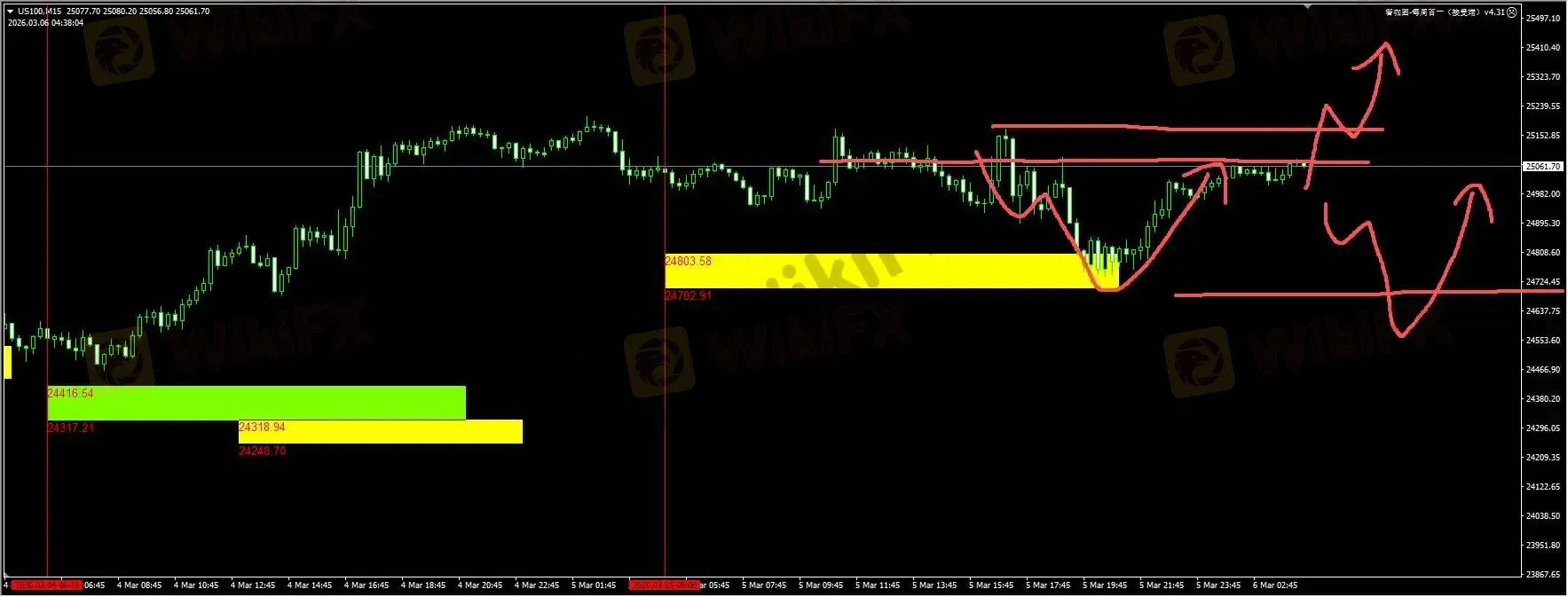 纳指:昨天我们插件提醒的,在24700-24800区域扫荡流动性的走势如期出现,下探之后,孕线上破开始反弹走势。日内关键阻力在25150附近,突破站稳可打开下一个波段的上涨空间。或者等待价格二次刷新24700附近的流动性之后,再考虑新的多头信号。详细位置请咨询插件。
