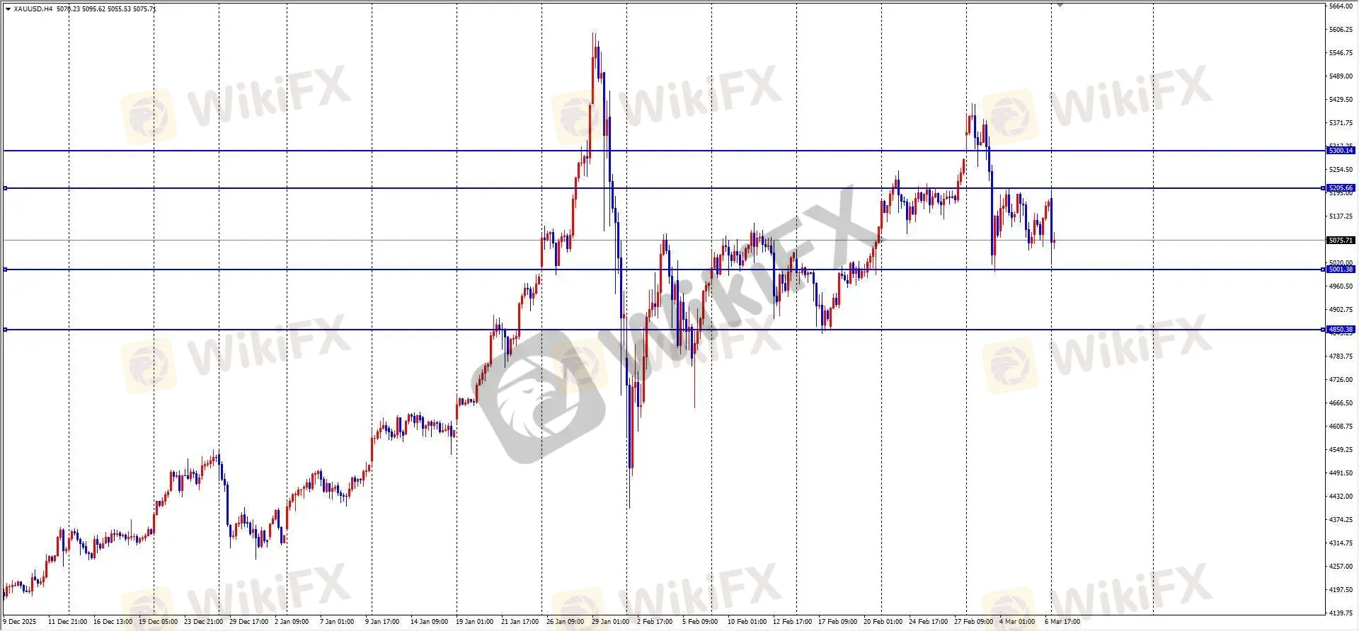 摘要:XAU/USD昨日回顾与ETO Markets观点上周五金价整体呈现宽幅震荡上行,受美国非农就业数据走弱支撑,但美元走强及油价飙升引发的通胀担忧形成短线压制。金价全天波幅约1161点,日线收阳。今早行情冲高至 5200 附近后快速回落,目前在 5010 附近获得支撑反弹。4小时图收出大阴线,显示上方抛压较重,短期行情仍处于宽幅震荡区间内。关键点位与操作建议上方阻力:5106、5130下方支撑:50