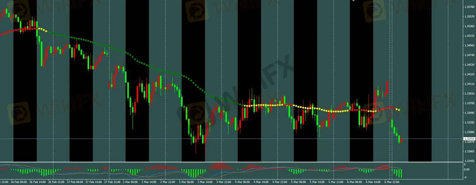 H1 三色线由黄转绿,空头信号明确。建议等待价格回调至 H1 趋势线附近入场做空,保护性止损设在 1.341 附近,盈利目标为开仓价格下方 60 点。若趋势线变红则需立即平仓离场。