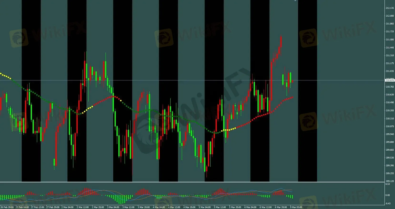 上周五镑日整体维持震荡上行并创出周内新高,日线收大阳线,全天波幅约 199 点。今早行情跳空低开,价格在 210.6 附近受到支撑。从 4 小时周期看,MACD 仍为金叉状态,但 1 小时周期出现死叉,显示行情短期可能进入调整,但整体多头趋势尚未改变。