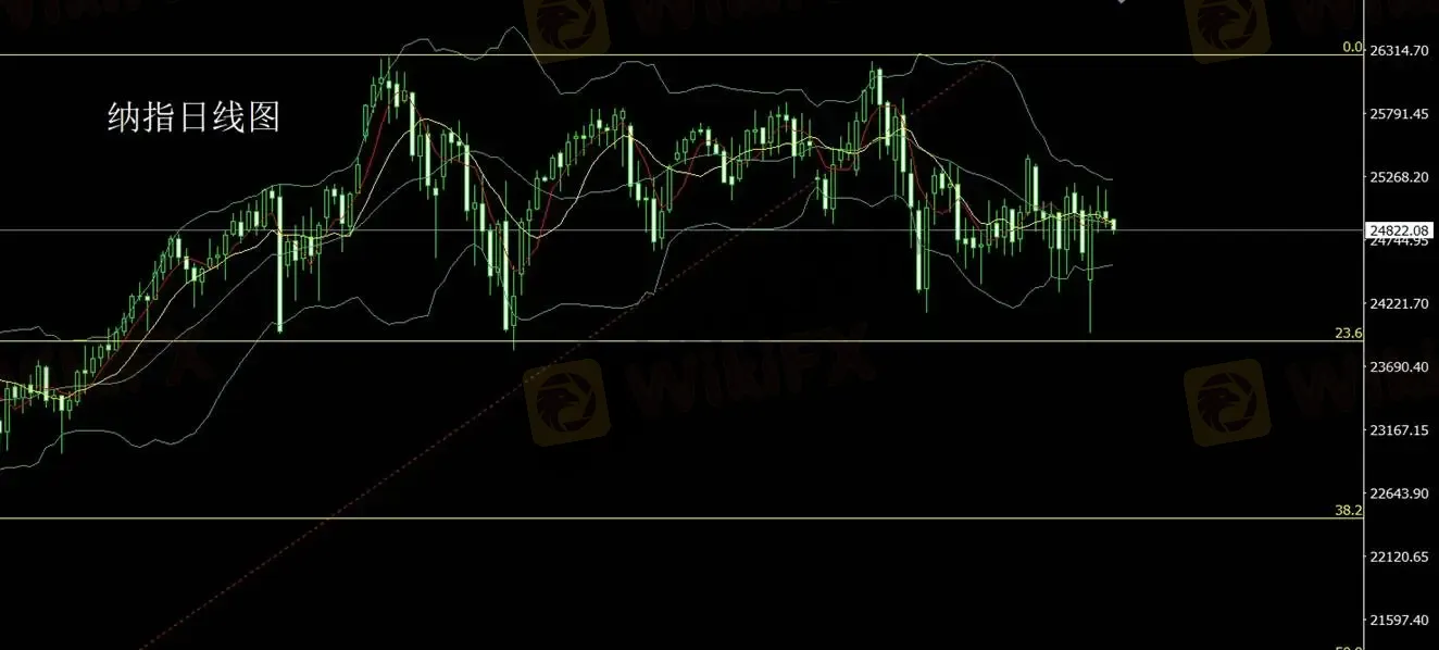 纳指昨日走势反复,盘中多次冲高回落,日线形成倒锤头形态。