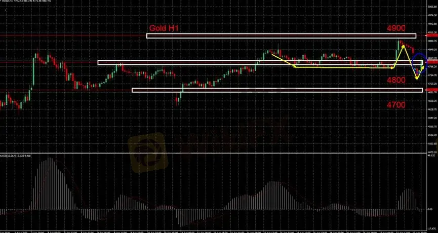 目前价格自4800一带支撑反弹后,一度冲高接近4900但未能站稳,随后出现回落,高档形成短线压力,整体结构转为区间震荡,且高位出现卖压迹象,多头动能开始放缓。