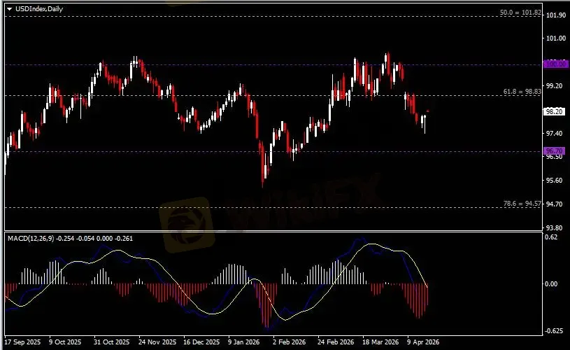 日线图显示美元指数企稳反弹,当前仍承压于98.80阻力。从MACD来看,快慢线向下运行,红色动能柱则温和收缩。指数走势基本和动能柱的变化一致。
