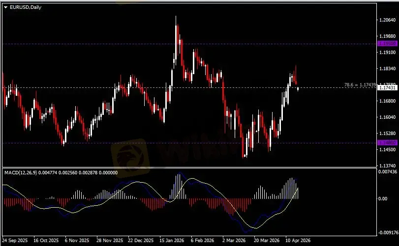 日线图显示欧元兑美元高位回调,当前仍收于1.1740支撑。从MACD来看,快慢线呈拐向,白色动能柱温和收缩。汇价走势基本和动能柱的变化一致。