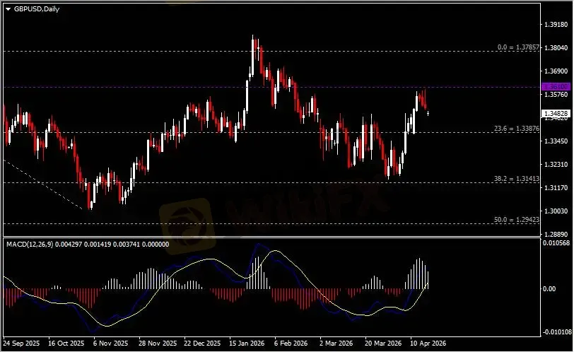 日线图显示英镑兑美元高位回调,当前承压于1.3610阻力。从MACD来看,快慢线呈拐向,白色动能柱温和收缩。汇价走势基本和动能柱的变化一致。