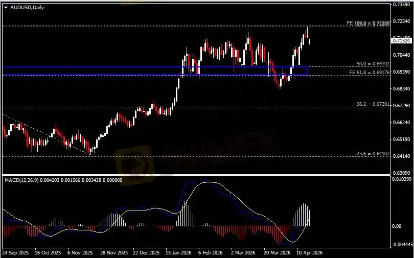日线图显示澳元兑美元先涨后跌,当前承压于0.7230阻力。从MACD来看,快慢线向上运行,白色动能柱则温和收缩。汇价走势基本和动能柱的变化一致。