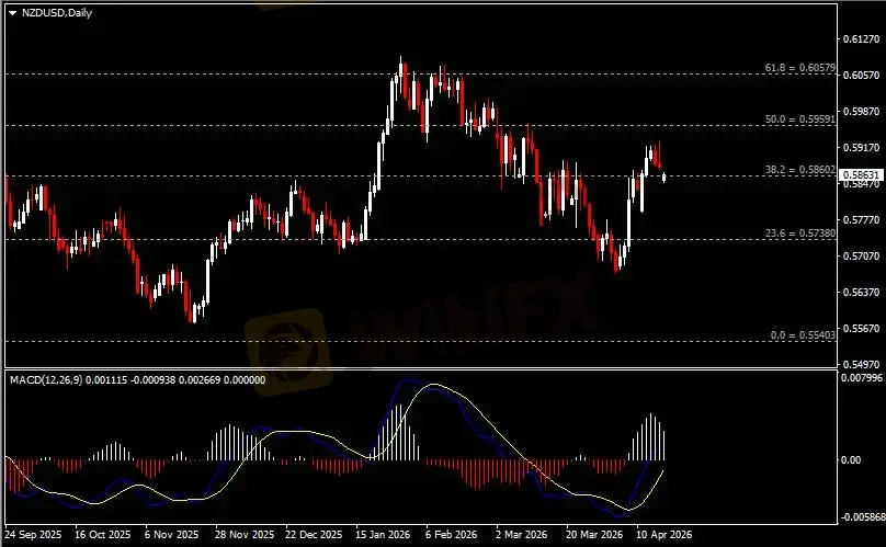 日线图显示纽元兑美元回调下挫,当前仍收于0.5860支撑。从MACD来看,快慢线呈拐向,白色动能柱温和收缩。汇价走势基本和动能柱的变化一致。