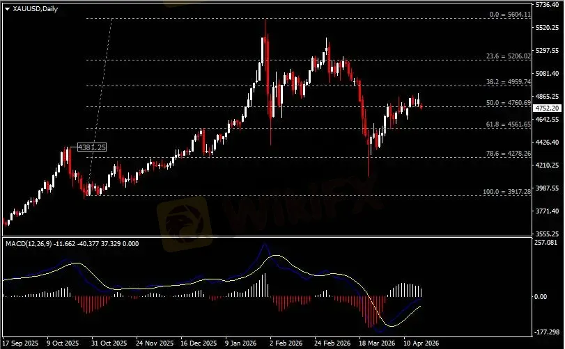 日线图显示金价震荡上涨,当前收于4760支撑。从MACD来看,快慢线向上运行,白色动能柱则温和收缩。金价走势和动能柱的变化呈分歧。
