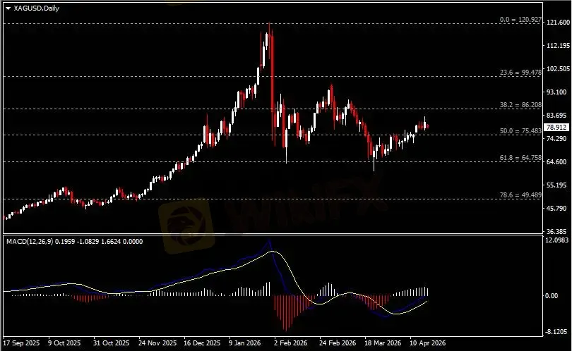 日线图显示银价震荡上行,当前仍收于75.50支撑。从MACD来看,快慢线向上运行,白色动能柱则温和收缩。银价走势和动能柱的变化呈分歧。