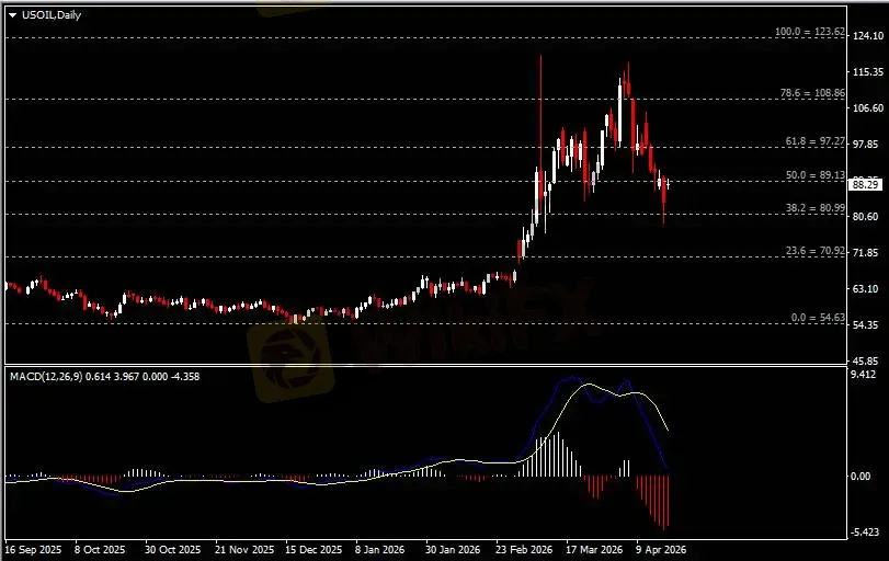 日线图显示油价震荡下挫,当前承压于前低89。从MACD来看,快慢线向下扩张,红色动能柱则温和收缩。油价走势和动能柱的变化呈分歧。