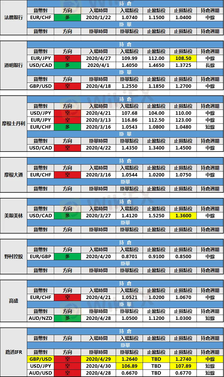 (1)道明銀行澳元/紐元多頭持倉盈利提前出局;修改歐元/日元空頭止損至108.50。