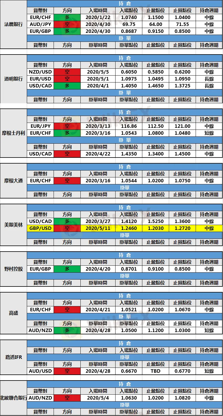 (1)美銀美林新增英鎊/美元空頭持倉,入場點位1.2460,止盈點位1.2030,止損點位1.2720。