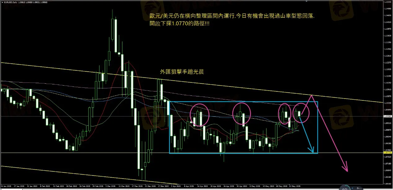 歐元/美元昨日K出現大陽線.自1.0890上漲至1.0995收盤在1.0980附近.老趙認為還是橫向盤整.上漲力道未能觸碰200日均價與上週高點1.1010.多頭力量稍嫌不足.今日若再次回落則關注下方重要支撐1.0770.今日拉加德的談話應該會給出明顯動能與方向!!!