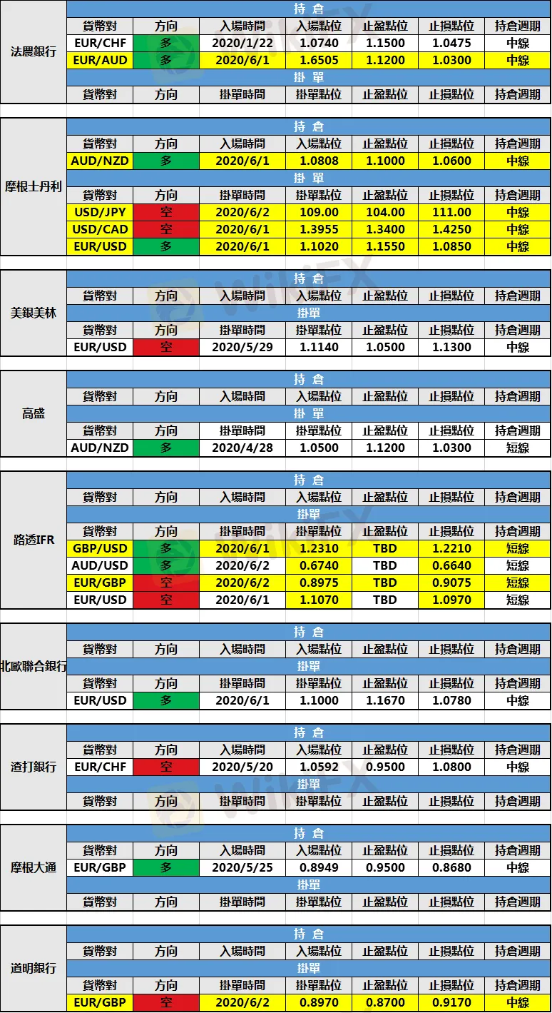 (3)摩根士丹利新增澳元/紐元多頭持倉,入場點位1.0808,止盈點位1.100,止損點位1.0600。歐元/日元空頭持倉虧損提前出局。