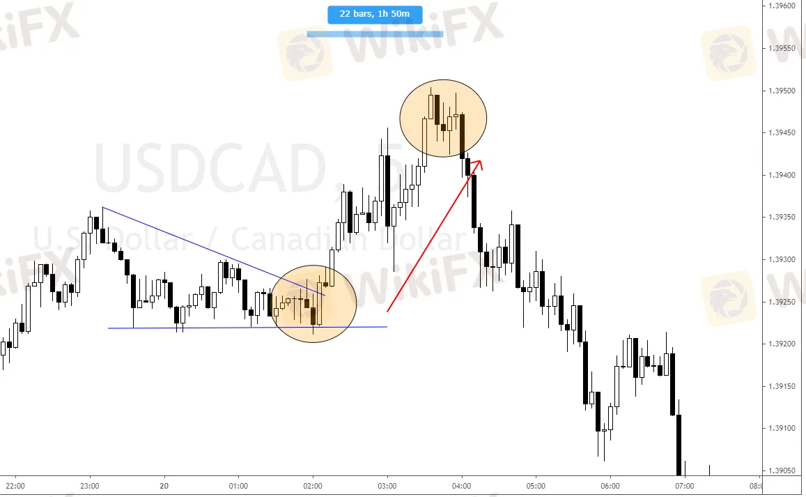 同樣是玩三角形圖形的經典策略,在五分鐘的圖表上,市場抵達目標價格所花費的K棒數量是最多的 (22根K),但總共花費的時間卻是最少的 (2小時)。