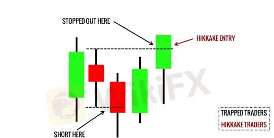 解讀:直接突破交易者在支撐阻力處直接突破做多,但是蠟燭收盤跌回支撐位而後被掃損,此時陷阱交易者做空!
