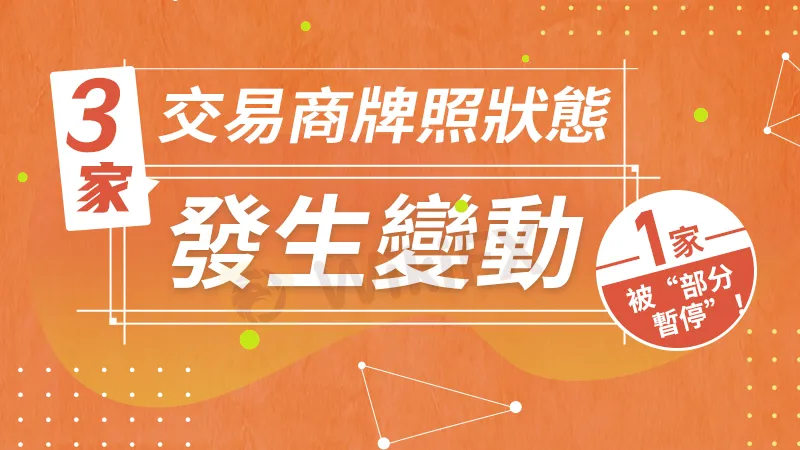本周共有3家交易商牌照狀態發生變動,其中1家牌照被“部分暫停”。這3家平台原先均持有塞浦路斯CySEC授權牌照,但近期因“這些實體在英國非法推廣其產品”而被CySEC停牌。